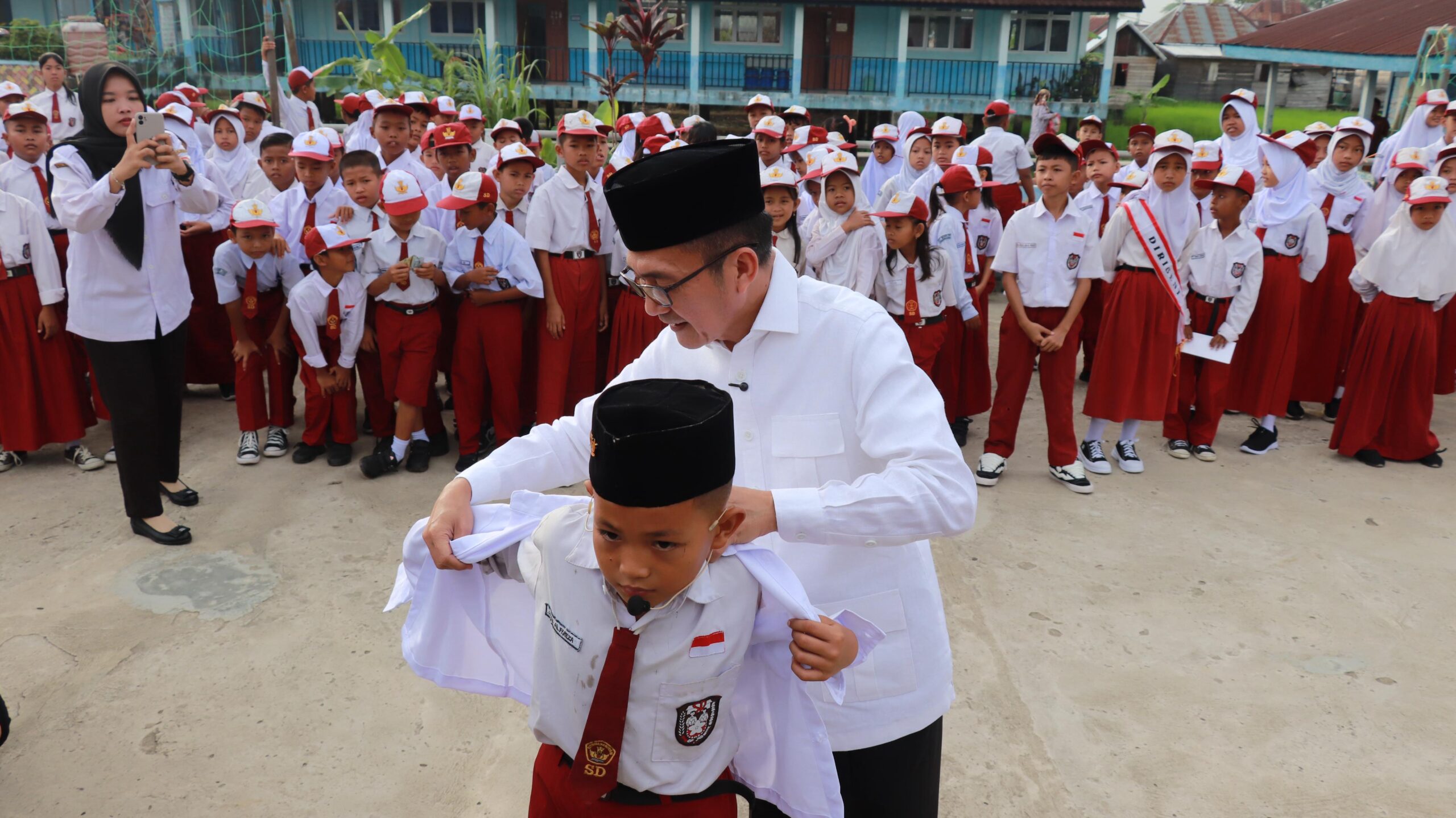 Sementara Sekda Palembang Aprizal Hasyim kebagian memimpin upacara serta bagi-bagi seragam gratis di SDN 135 Sukarami.