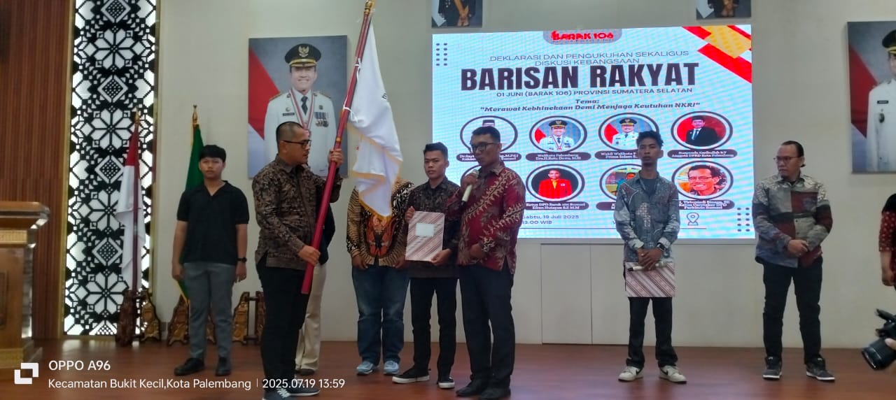 MAKLUMATNEWS.com Palembang.——Barisan Rakyat 01 Juni (Barak 106) Provinsi Sumatera Selatan resmi dideklarasikan dan dikukuhkan dalam acara yang dirangkai dengan diskusi kebangsaan bertema “Merawat Kebhinekaan Demi Menjaga Keutuhan NKRI”, Sabtu (19/7/2025), di Rumah Dinas Wali Kota Palembang.