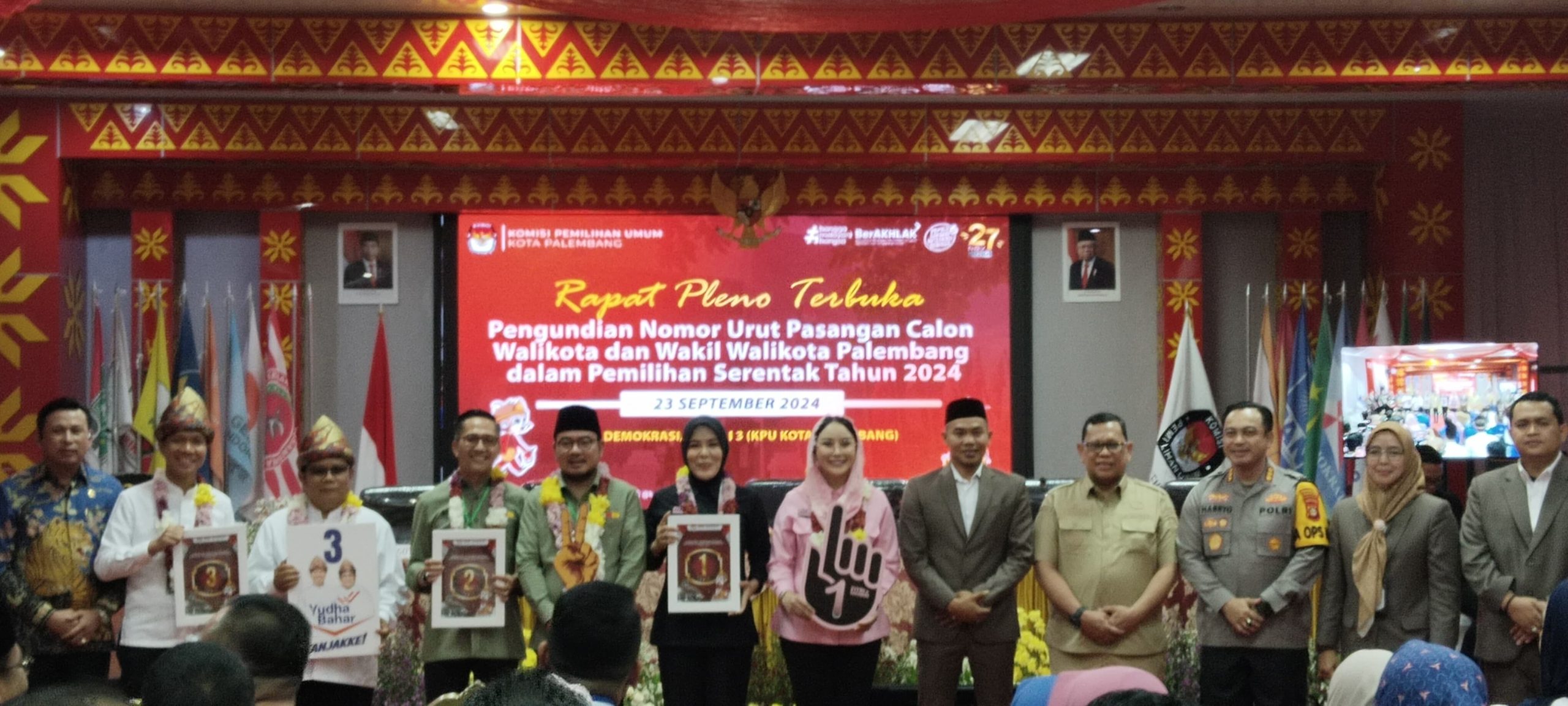 MAKLUMATNEWS.com Palembang,—-Nomor urut tiga pasangan calon Walikota dan Wakil Walikota Palembang periode 2024-2029 secara resmi telah ditetapkan.