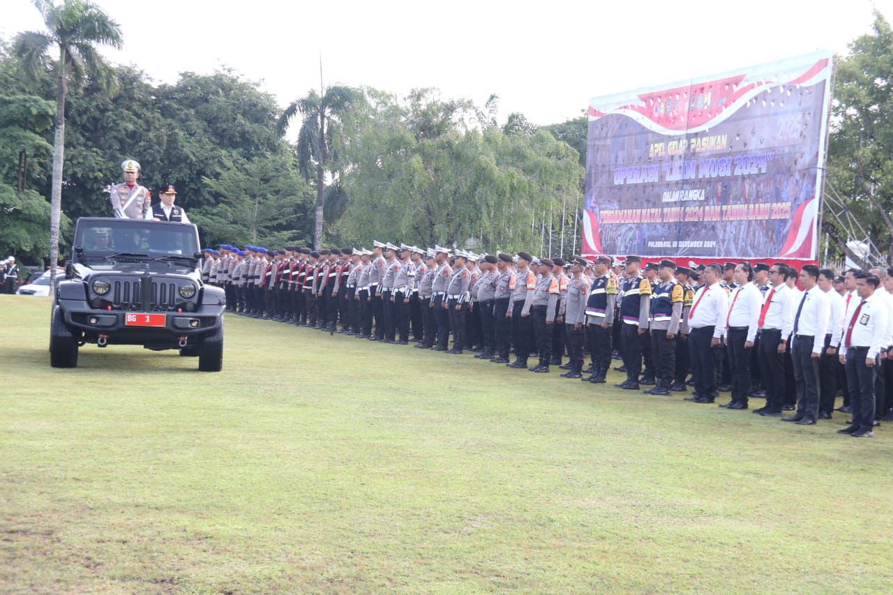 MAKLUMATNEWS.com, Palembang, — Dalam Rangka Kesiapan Pelaksanaan Operasi Lilin Musi 2024. Polri, Pol PP, DDishub dan TNIĀ menggelar Apel Pasukan guna mempersiapkan keamanan jelang Natal dan Tahun Baru (Nataru) 2025 di Griya Agung, Jumat (20/12/2024).