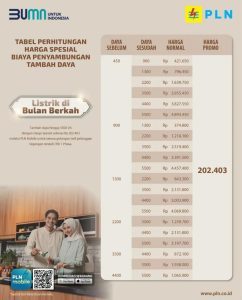 Promo ini berlaku bagi penambahan daya pelanggan 450 Volt Ampere (VA) hingga ke daya 5.500 VA. Pada harga normal, biaya tambah daya dari 450 VA ke 5.500 VA sebesar Rp 4.893.450. Promo ini berlaku hingga 05 April 2024 dan bisa didapat hanya melalui fitur ‘Marketplace’ di aplikasi PLN Mobile dengan syarat dan ketentuan yang berlaku.