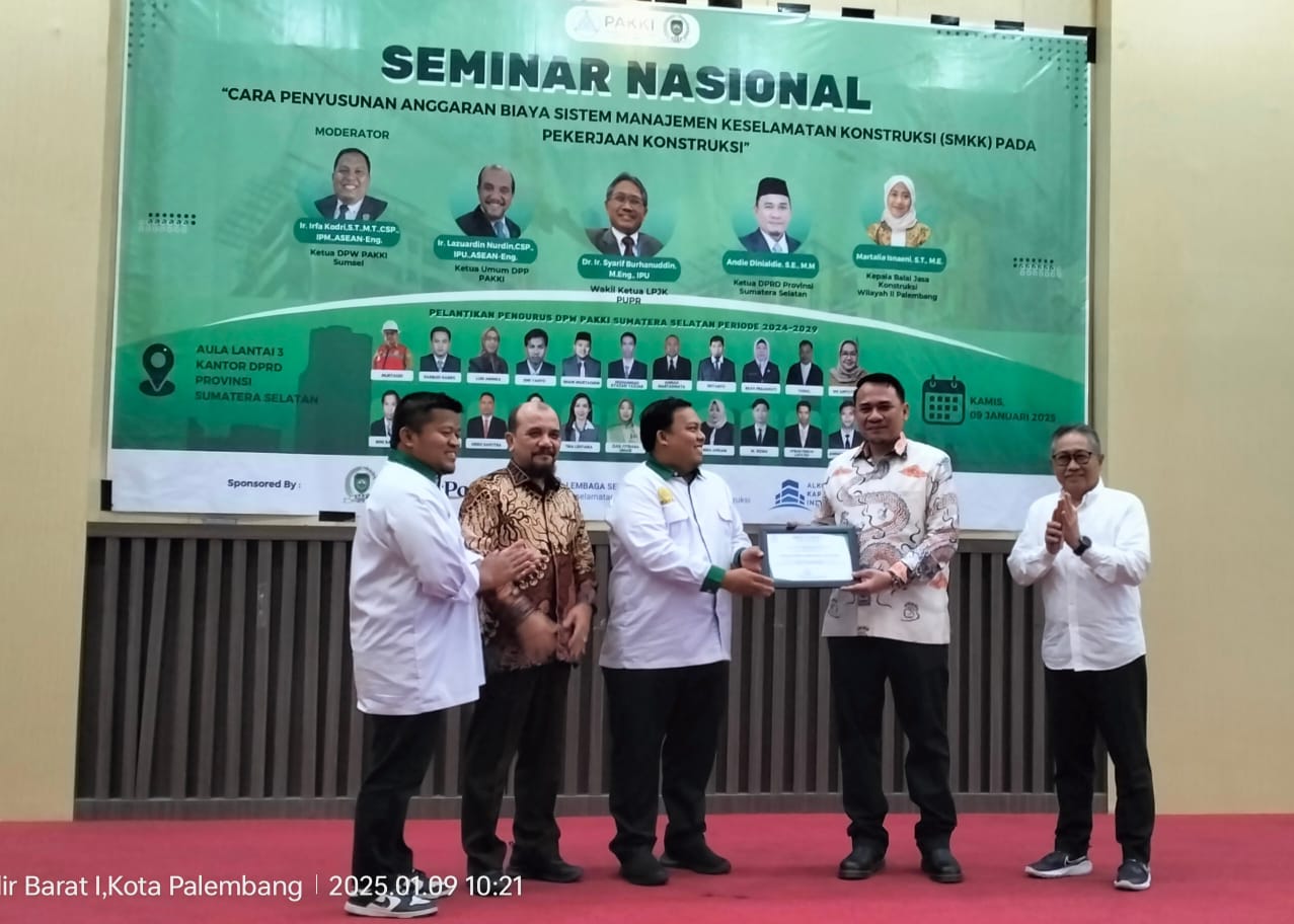 MAKLUMATNEWS.com Palembang.—-Pelantikan Pengurus DPW Perkumpulan Ahli Keselamatan Kontruksi Indonesia (PAKKI) Sumsel Periode 2024-2029 dan seminar nasional dengan tema “Cara Penyusunan Anggaran Biaya Sistem Manajemen Keselamatan Kontruksi (SMKK) pada Pekerja Kontruksi dilaksanakan di Aula Lantai 3 Gedung DPRD Provinsi Sumsel, Kamis (9/1/2025).