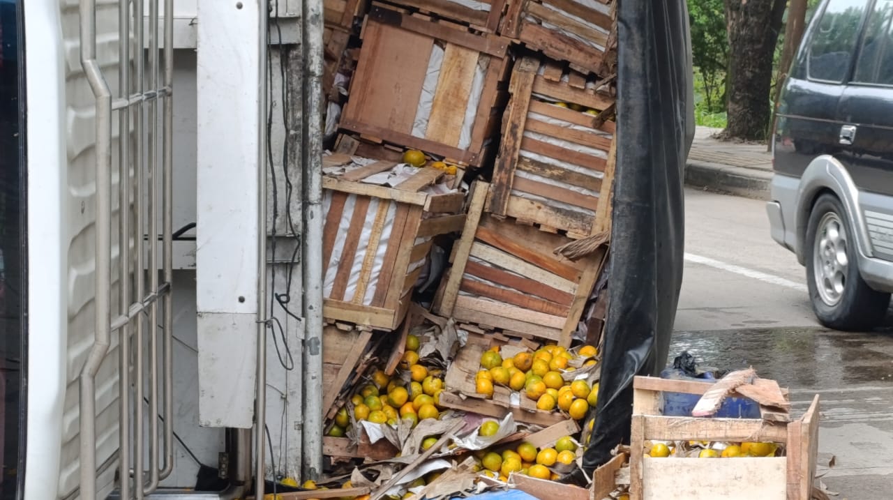 Dari pantauan di lokasi truk terguling di tengah jalan yang membuat jalan yang bisa dilalui kendaraan menyempit. Sebagian jeruk yang ada di dalam peti ikut keluar dari truk.