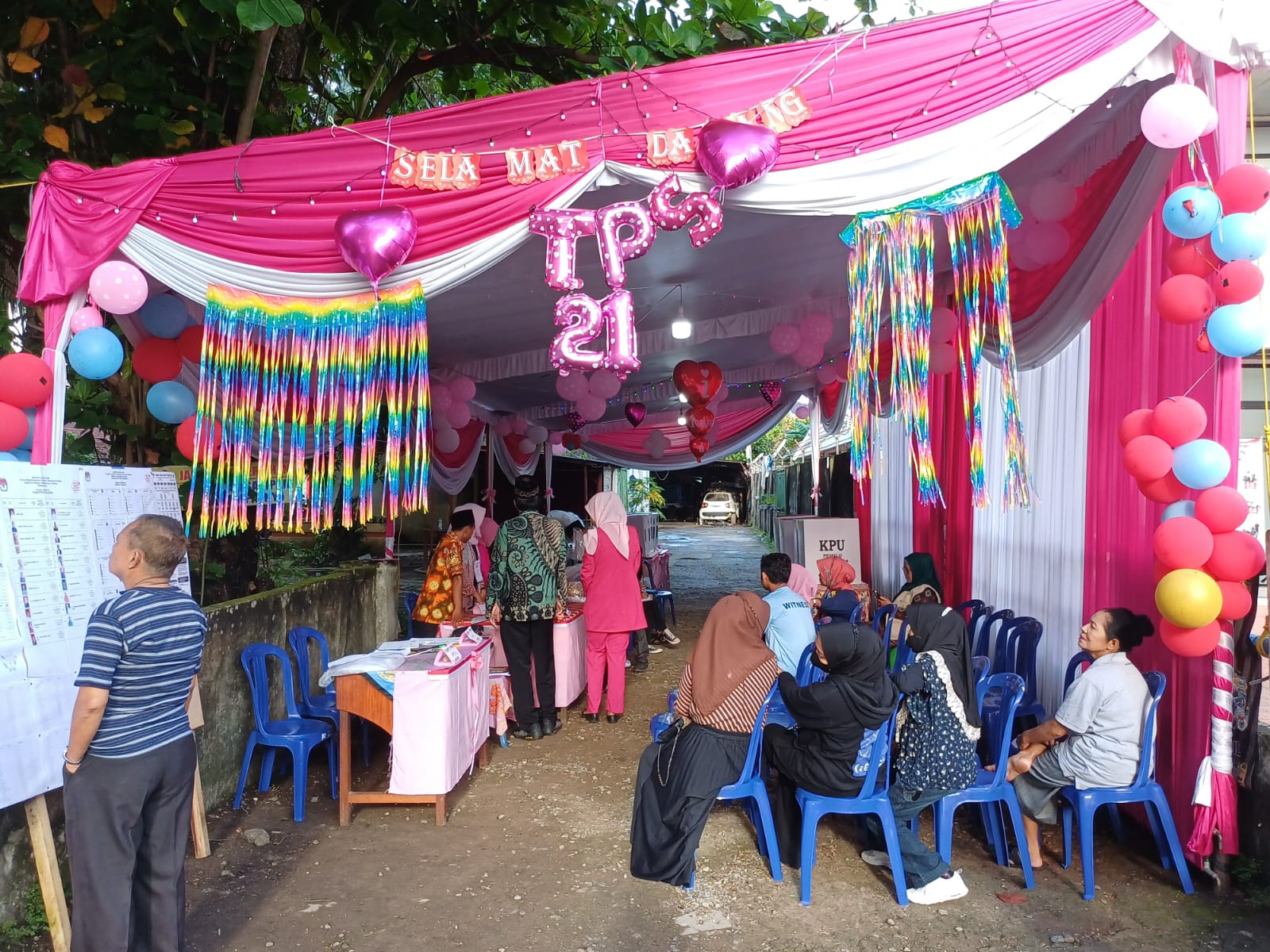 Beberapa posko pemilihan seperti TPS 21 di Mayor Santoso dan TPS 53 di Kancil Putih, mulai dari tenda TPS, dan seragam pakaian petugas TPS berwarna pink.